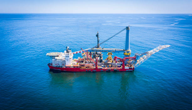 Drilling rig and support vessel on offshore area, sea and clean blue sky